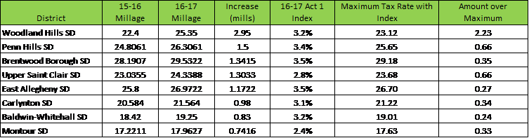 Besides the ten districts that were granted Act 1 exceptions and increased taxes below or above their index, thirteen other districts in Allegheny County raised taxes in 2016-17 but at a rate below or at their index. This group included Steel Valley, West Jefferson Hills, and Quaker Valley, all of which raised taxes to their index.